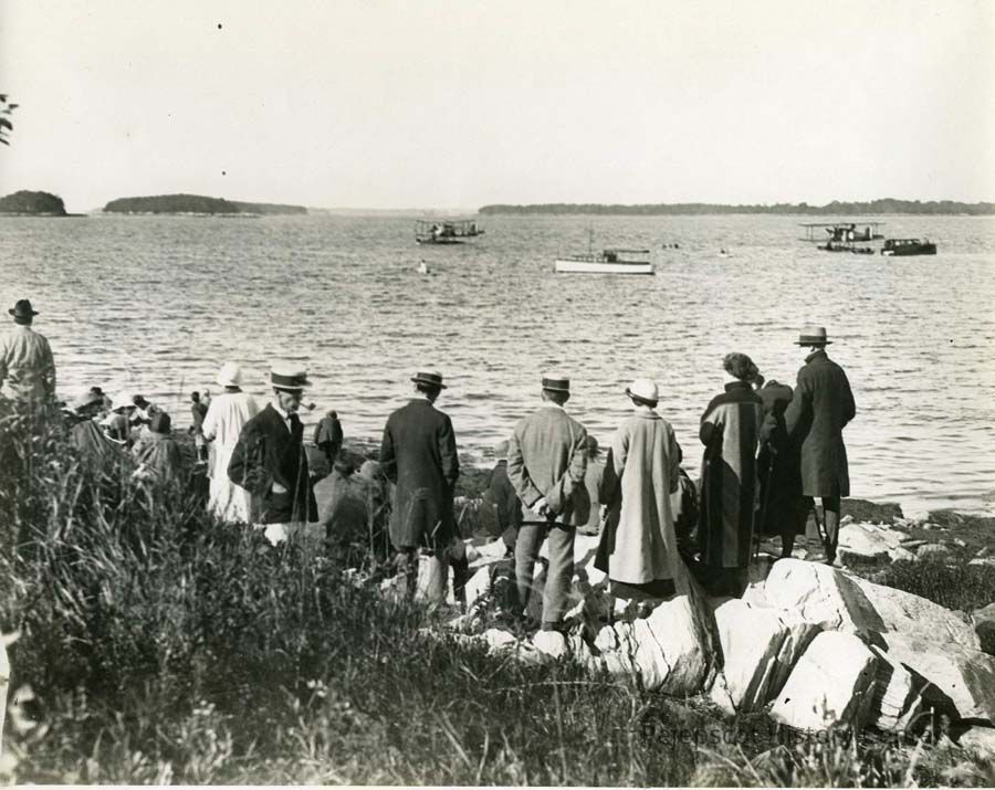Photo of group looking at "Round the World Flyers" from the Stetson property, Mere Point, Brunswick, Maine, 1924. Sea planes "Chicago" and "Boston II". See the commemorative monument at Mere Point, shown on record 1992.40.36b.Lexicon