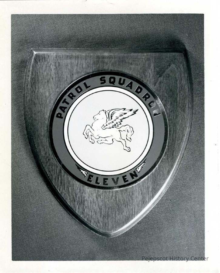 Black and white photograph of a seal of "Patrol Squadron Eleven" mounted on a shield. A flying horse in the center of the seal. Undated