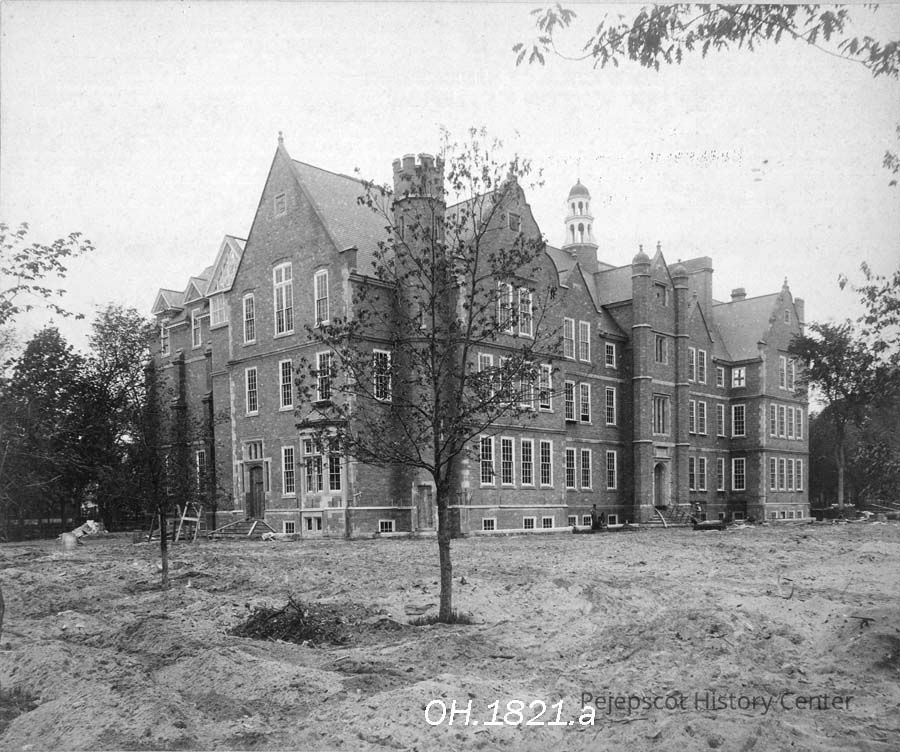 A B/W photograph of the Searles Science Building, Bowdoin College, Brunswick, ME. Not dated. Written on back, "Henry C. Upton".