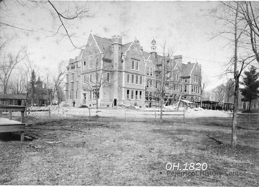 A B/W photograph of the Searles Science Building, Bowdoin College, Brunswick, ME under construction in 1894. The First Parish Church can be seen at the far right. Not dated.