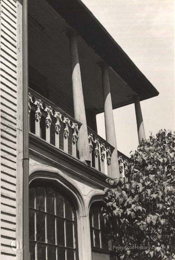 A B/W photograph of the second floor porch at the Chamberlain Home. Undated