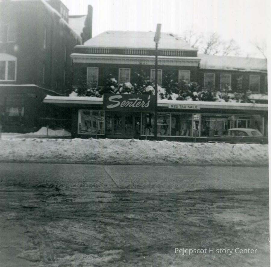 A B/W photograph of Senters store at 128 Maine Street. The end of the Town Hall can be seen. This is where Riley Insurance Agency was located.