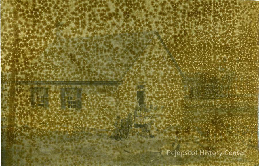 A sepia-toned photo of the Growstown School on Woodside and Church Streets in Brunswick, ME. There are several children outside the door of the school. Undated.