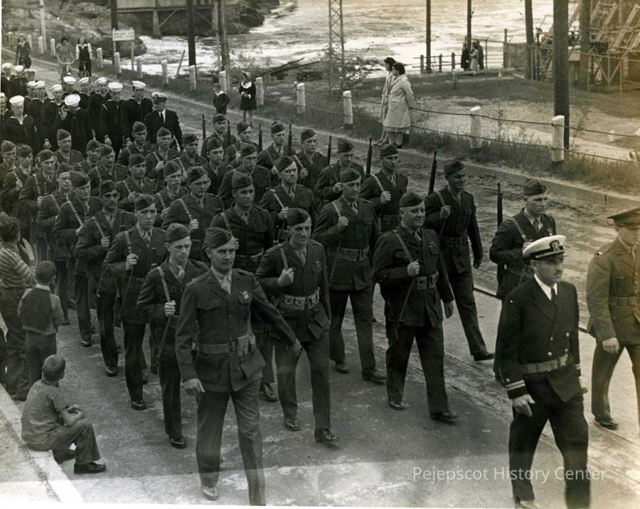 A B/W photograph of servicemen marching in the Bicentennial parade on Maine Street Brunswick. 1939
