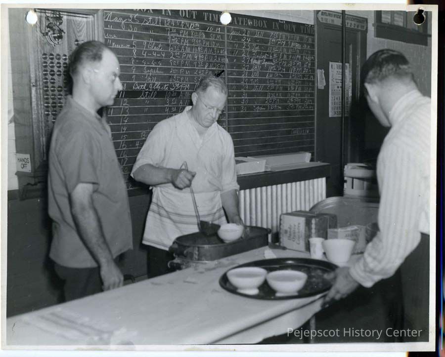 A black & white photograph of soup being served by two men at the Brunswick Fire Station. Undated. Fred LeForte in center.