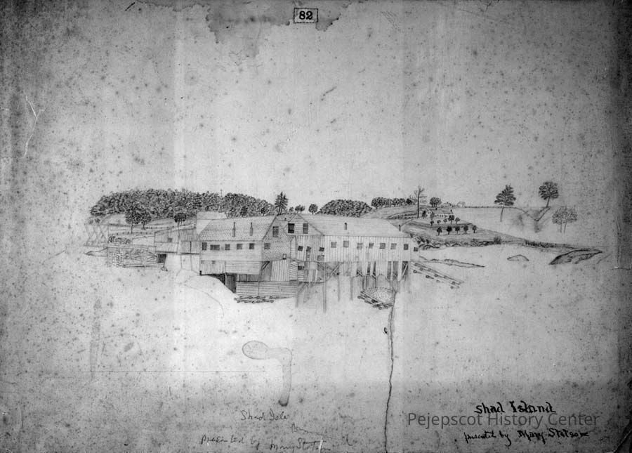 A B/W pencil drawing of Shad Island, Brunswick, Maine, and it's buildings.