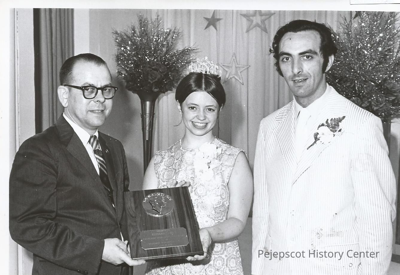 Sharon Hinckley is presenting the pageant award to Dick Tomko for his many years of service to the pageant while Gene Gagne is looking on.