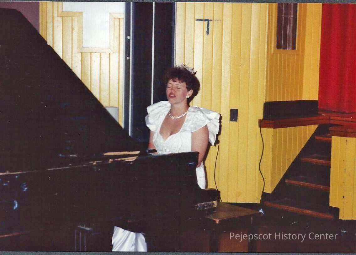 A color photograph of Sharon singing and playing, "The Glory of Love". Photographer's # A-35 CYO sponsored