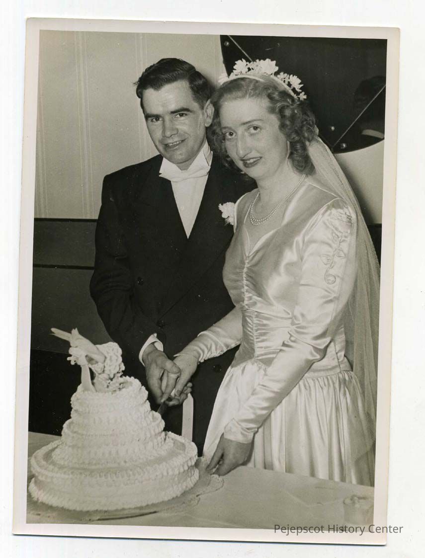 Edna Satira Shaw and Charles St. Pierre cutting the cake at their wedding reception. 05/14/1946