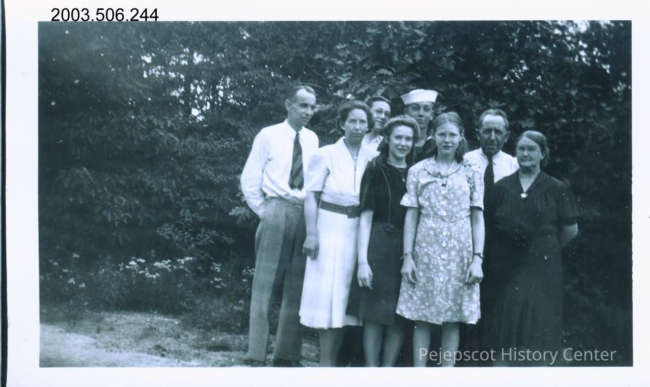 A B/W photograph of the Shaw family. Mother, Father and Ken in back row. Bill with Navy cap and Grandmother, Grandfather (John and Clara Woodward) next row. Madelyn and Jeannette in front.