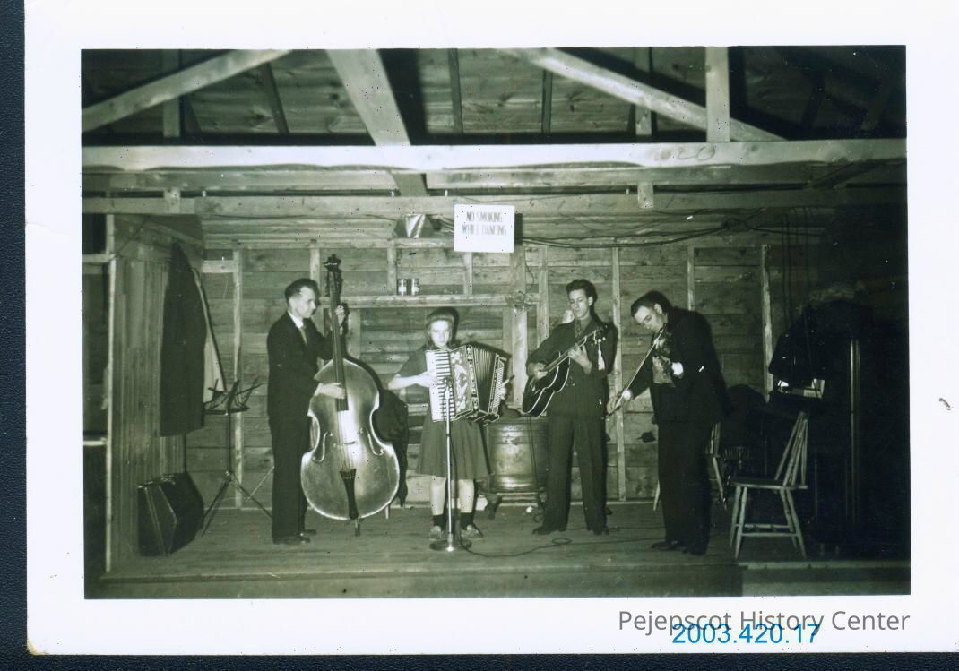 A black and white photograph of the Shaw trio (all 4 of 'em) of Brunswick, playing in West Paris, Maine, for the Polish War Relief, was taken in 1939. Members are Laurence Shaw on bass, Madelyn Shaw on accordion, Charlie McCarthy on guitar and [unknown] Vermette on violin.