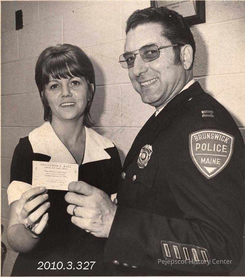 A B/W photograph of Brunswick Police Secretary Sherrie Worth with a ticket to the policeman’s ball from Lt. Larry Joy. Marked on the back, "Brunswick Policeman's Ball." No clipping. Undated