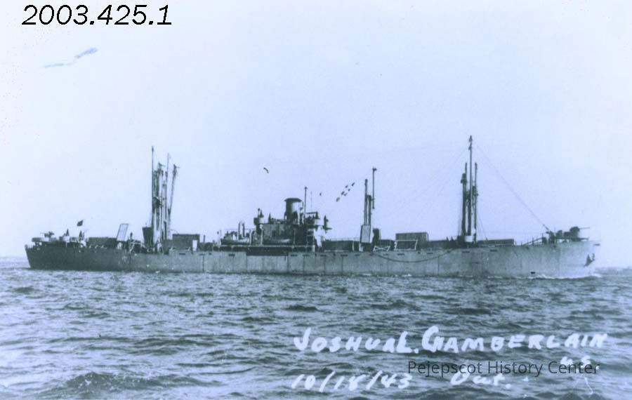 A black and white photograph of the liberty ship "Joshua L. Chamberlain," was taken by the U.S. Coast on 10/18/1943.