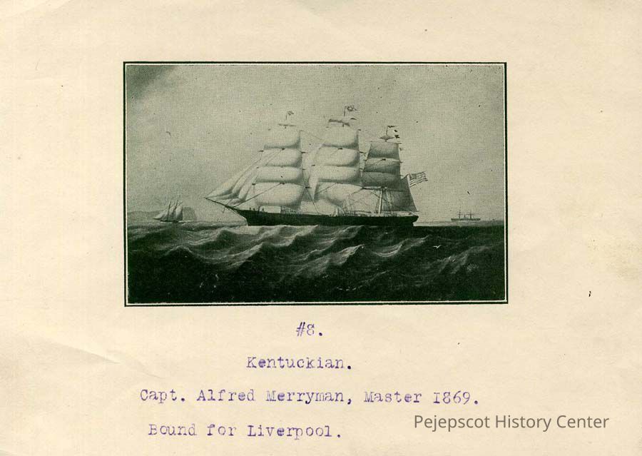 A black and white print of a painting of the ship Kentuckian, captained by Alfred Merryman (Master) in 1869, bound for Liverpool. Print is undated.