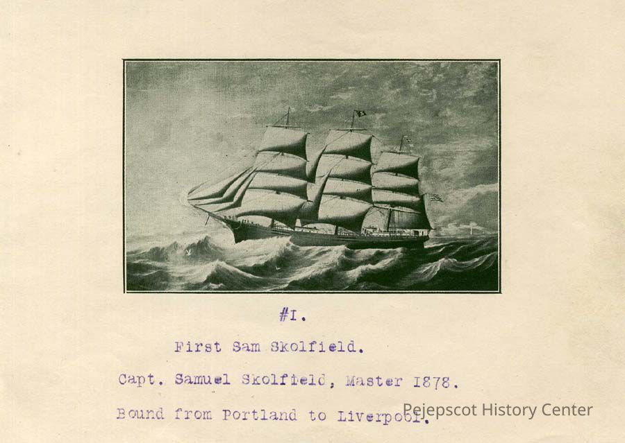 A black and white print of the first ship Sam Skolfield, with Capt. Samuel Skolfield , Master, 1878, bound from Portland, Maine to Liverpool. Print is undated.