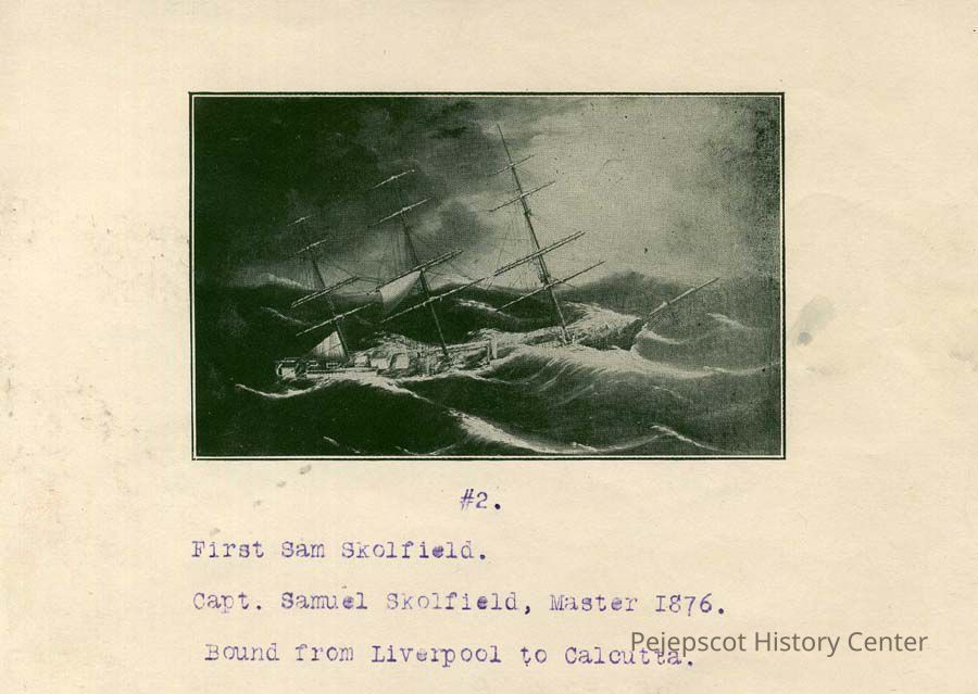 A black and white print of the first ship Sam Skolfield, with Capt. Samuel Skolfield, Master, 1876, bound from Liverpool to Calcutta. Print is undated.