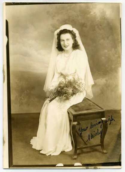 Shirley Murray Coolen in her wedding gown, sitting on a bench. On the photo it says "Your loving wife, Shirley." Shirley was murdered, and was found in a garden behind the Senter house on the corner of Park Row and Green Street. UndatedCollection