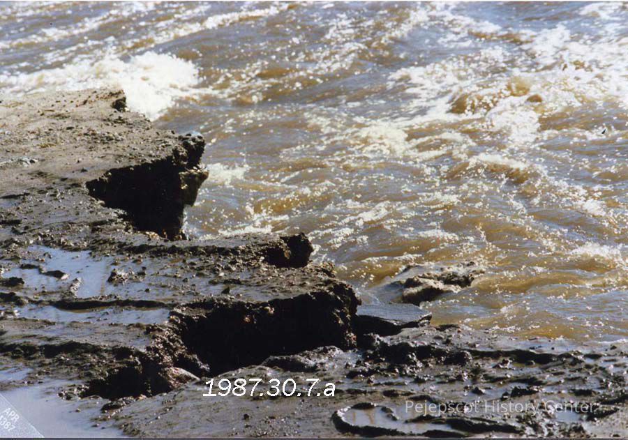 A color photograph of the shore near the Swinging Bridge on the Topsham, Maine side. April 2, 1987 flood.