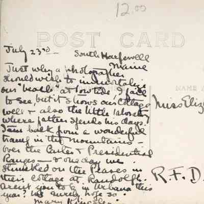 Just why a photographer should wish to immortalize our "beach" at low tide, I fail to see, but it shows our cottage well & also the little laboratory where father spends his days. Just back from a wonderful tramp in the mountains - over the Carter & Presidential Ranges - & one day we stumbled on the Peases in their cottage at Randolph. Aren't you to be in Urbana this year? We surely hope so. Mary Kingsley