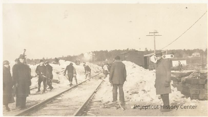 A B/W photograph of a group of men working on shoveling snow off the railroad tracks in Brunswick, ME. Undated.