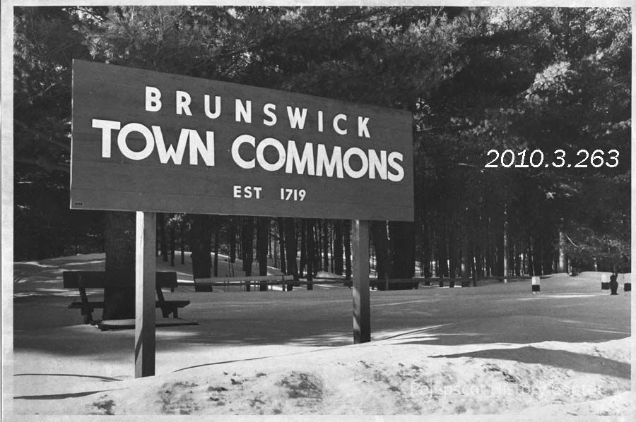 A B/W photograph of the sign at the Brunswick Town Commons. Photo taken in the winter. Written on the back of the photo, "There's year-round."