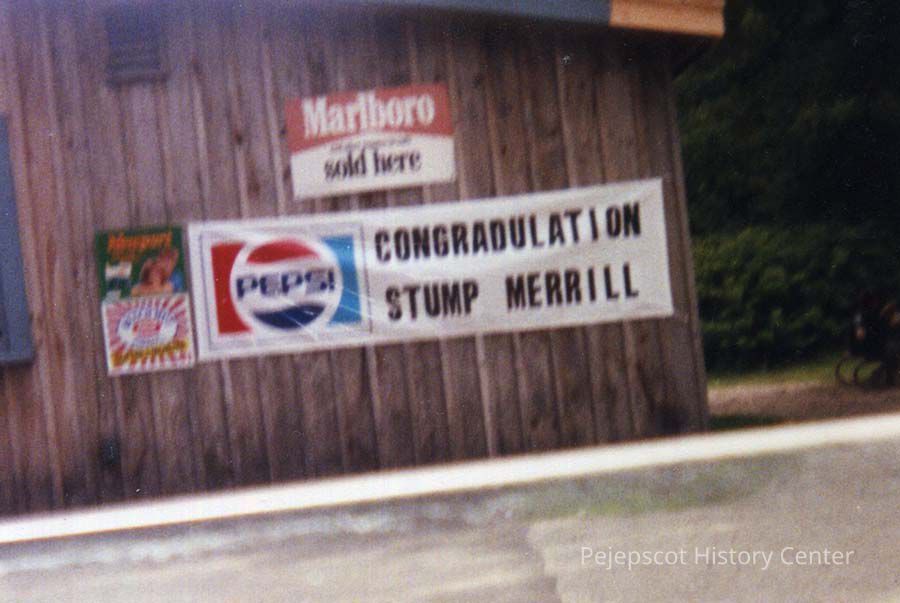 A sign on Michaud's Market on Jordan Avenue, which reads, "Congradulation [sic] Stump Merrill." Carl "Stump" Merrill was made manager of the NY Yankees baseball team for the 1990 and 1991 seasons. He was born and lived at 59 Jordan Avenue. His mother, Emeline Merrill, still lives there (as of 1990). 1990Collection