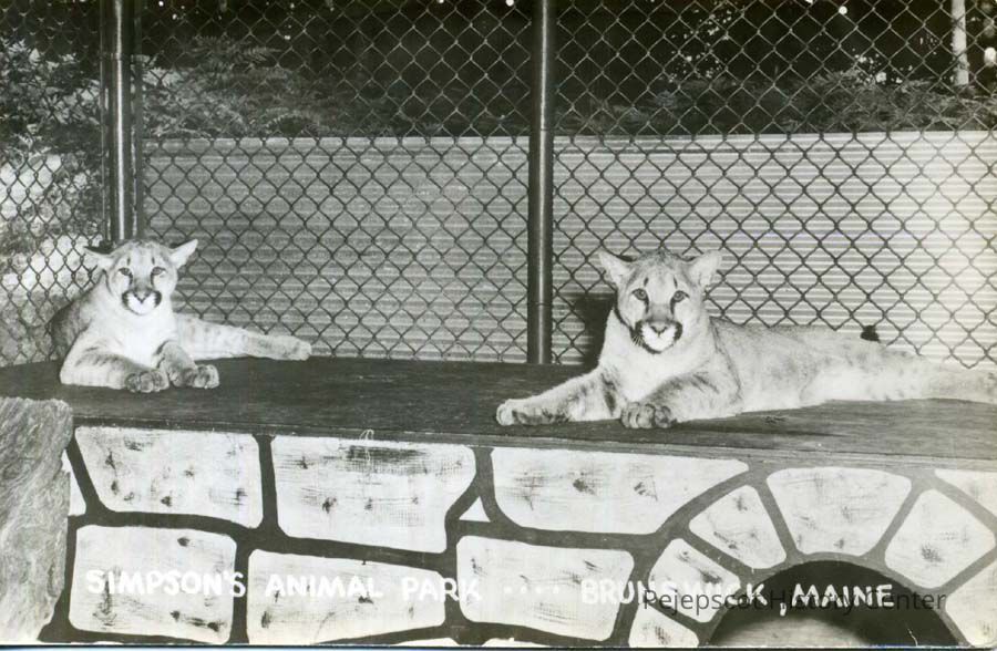 An undated black and white postcard of two mountain lions at Simpson's Animal Park in Brunswick, Maine.Collection