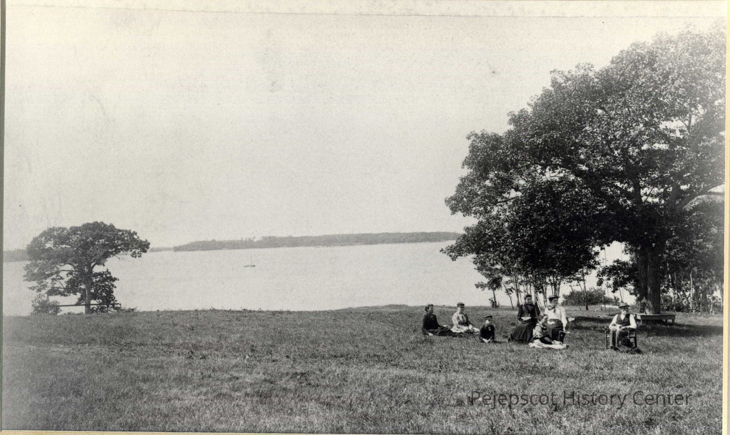 B/W photo of a family on the lawn of Joshua Chamberlain's summer home, Domhegan, Simpson's Point, Brunswick, ME. ca. 1890's