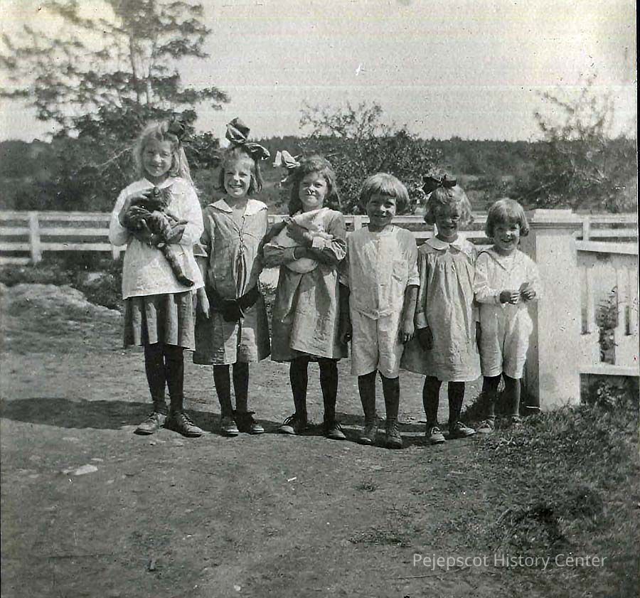 A B/W photograph of 6 little girls. Two of them are holding cats. Undated