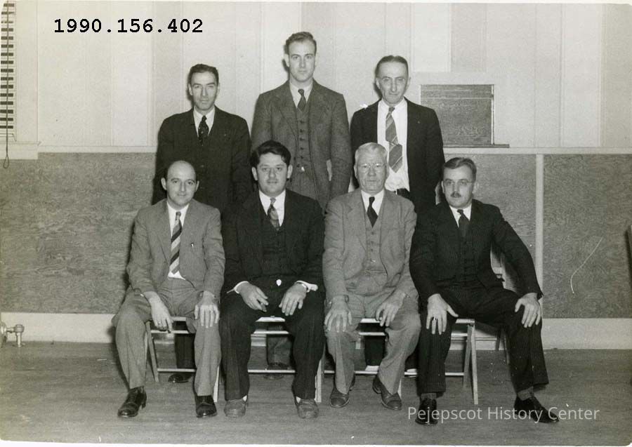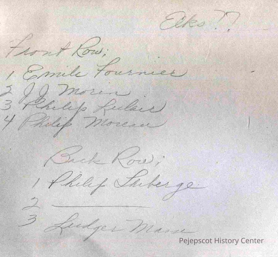 A B/W photograph of six men. They are front row l to r: Emile Fournier, J. J. Morin, Philip Leclair and Philip Moreau. Back row l to r: Philip Theberge, unk, Lorenzo Masse. Marked on the back, "ELKS???" Undated