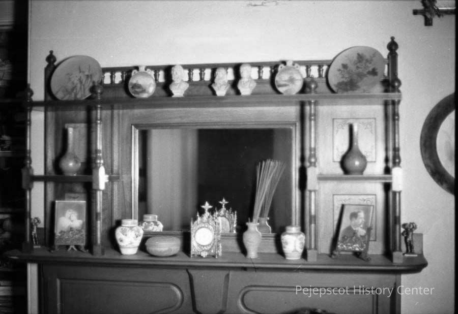 A B/W photographic view of the interior of the Skolfield-Whittier House library.Collection