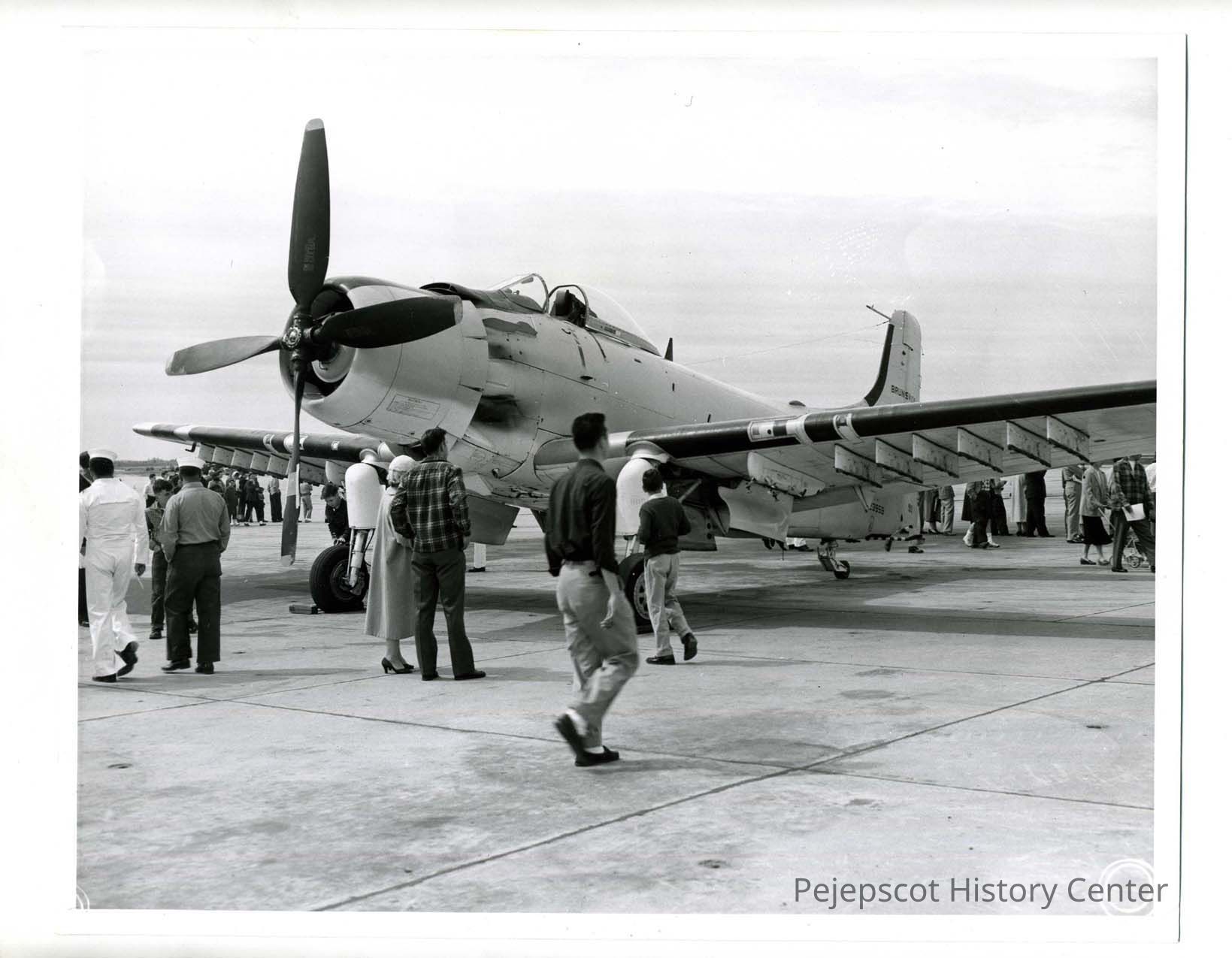 "SKYRAIDER on display. Armed Forces Day was the occasion for NAS Brunswick to show its AD attack aircraft. This carrier based plane was the Navy's 'workhorse' of the Korean War. It is capable of carrying well over 10,000 pounds of bombs or rockets, a load which is equal to that carried by the B-17 during WWII." The back is stamped with "U.S NAVAL AIR STATION BRUNSWICK, MAINE" and "OFFICIAL PHOTOGRAPH NOT TO BE USED FOR PUBLICATION BY ORDER OF THE CHIEF OF NAVAL OPERATIONS." Undated