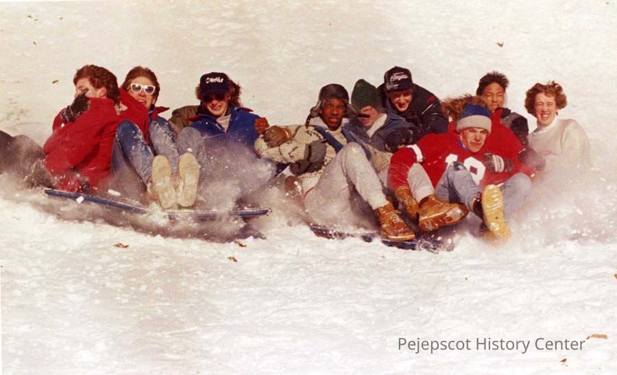 A color photo of unknown youths sledding in Topsham, Maine, was taken on 2/9/1988.