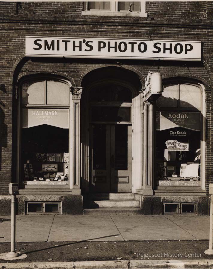 A B/W photograph of the store front of Smith's Photo Shop at 146 Maine Street. Undated