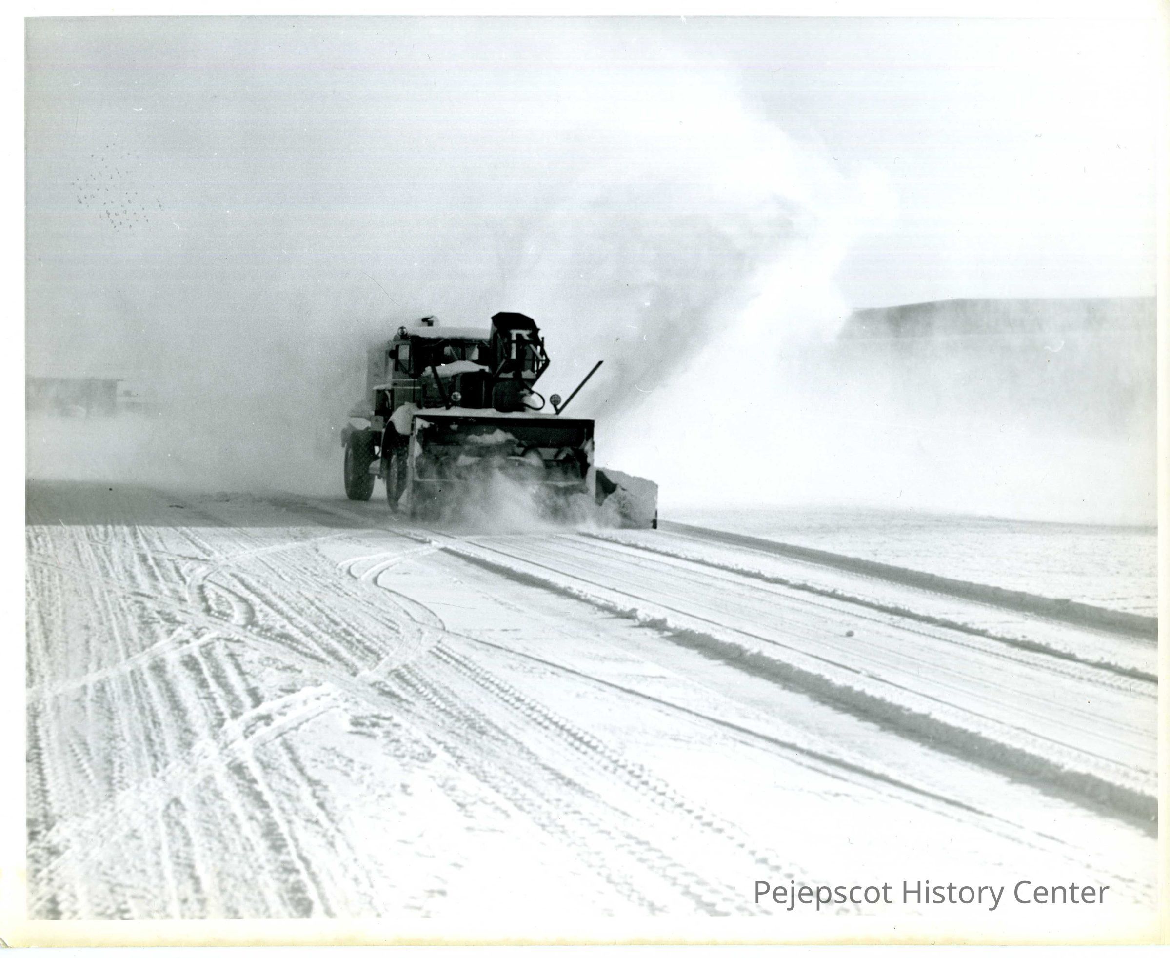 Black and white photograph of snow blower on Naval Air Station runway. Undated