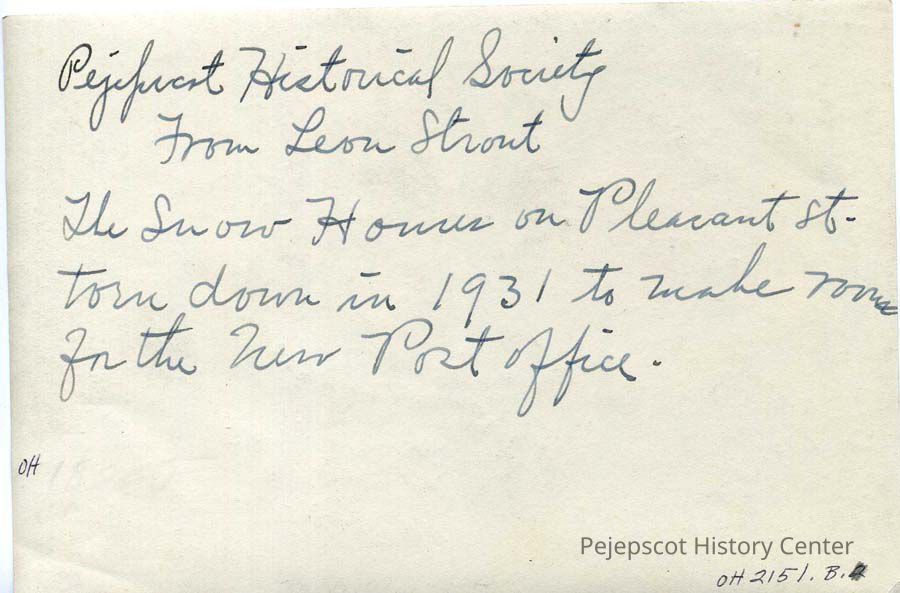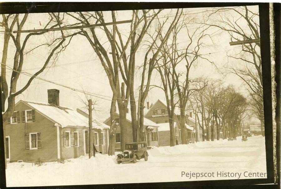 B/W photo of Snow House (behind the automobile and trees) and 2 others on Pleasant Street, Brunswick torn down to make space for new Post Office