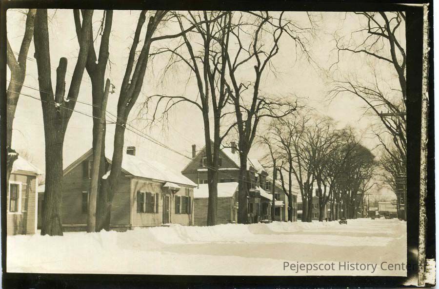B/W photo of the Snow house and 2 others on Pleasant Street, Brunswick, torn down to make space for new Post Office. The Colonial style house beyond was once the home of Charles Lowery, later Tyler Interiors.