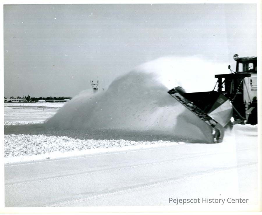 Black and white photograph of snow plow in action on Naval Air Station runway. Undated