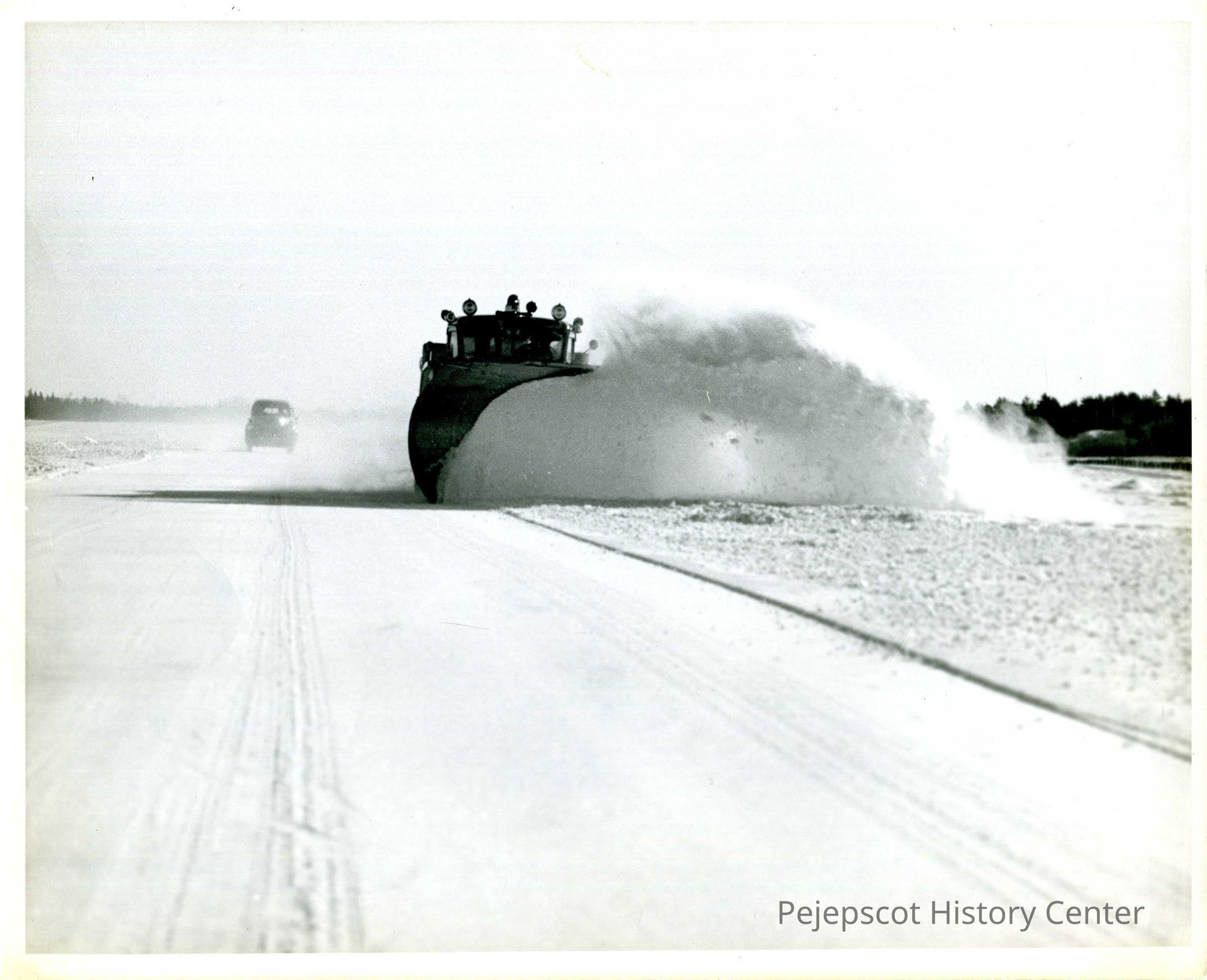 Black and white photograph of snow plow on Naval Air Station runway. Undated
