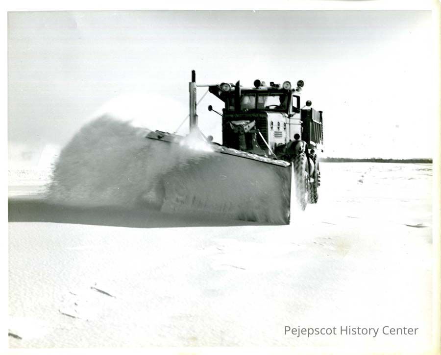 Black and white photograph of a snow plow in action on Naval Air Station runway. Undated
