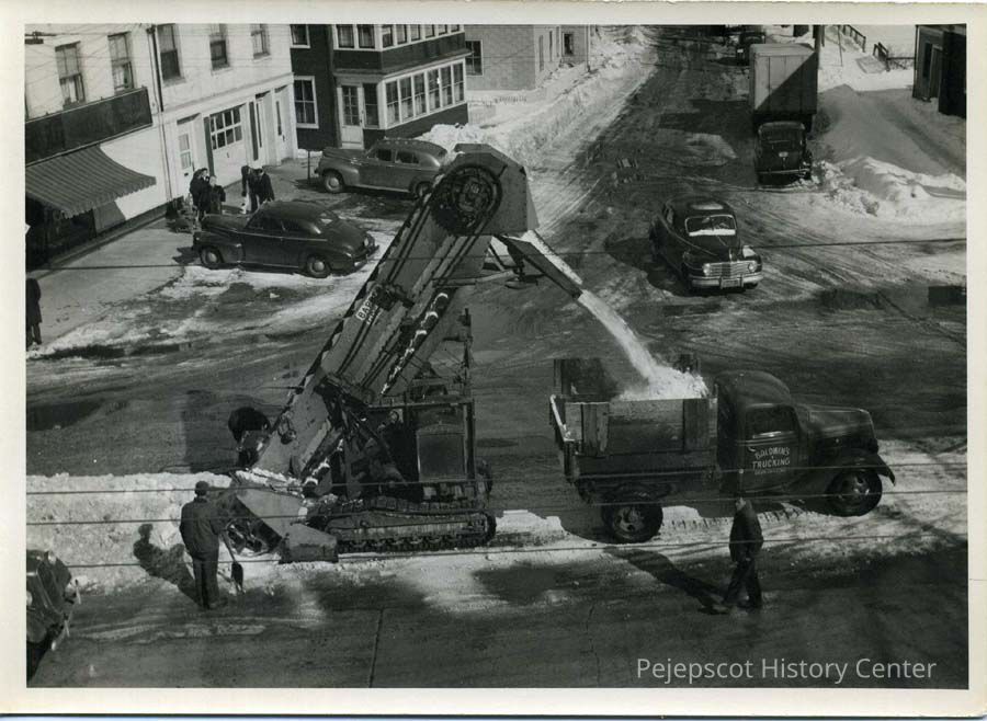 B/W photo of snow removal at the corner of Maine and Mason Streets, 1952.