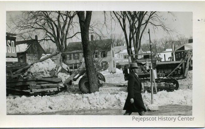 Snow removal, near 135 Maine St., Nichols House. Next to Nap's Bakery and Electric Company, Snow Block.