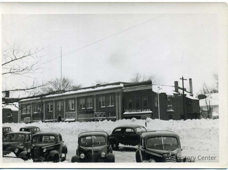B/W photo of snow scene of 87-91 Maine Street, 1952.