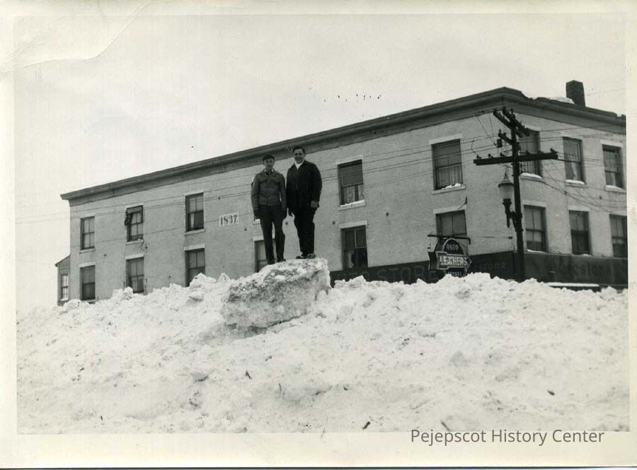 B/W photo of two unidentified boys standing on top of a snowbank in front of the St. Onge Block, Brunswick, 1952.