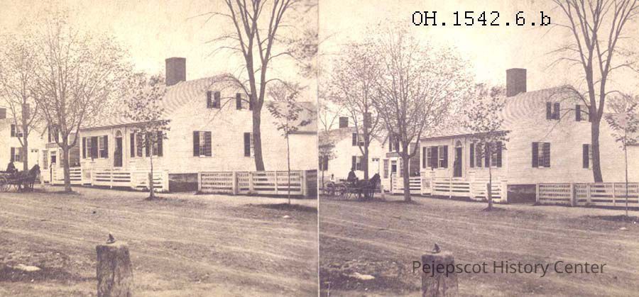A B/W stereo view of Snow's Bakery, Pleasant Street, Brunswick, ME. Undated