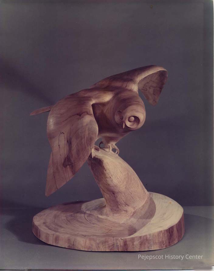 A color photograph of a sculpture of a Snowy Owl (Nyctea scandiaca). It is carved out of elm wood by Charles G. (Chippy) Chase. It is 22 inches tall. No. 282. Undated