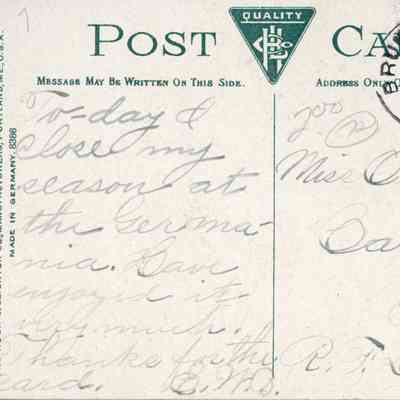 Today I close my season at the Germania. Have enjoyed it very much. Thanks for the card. E.W.D.