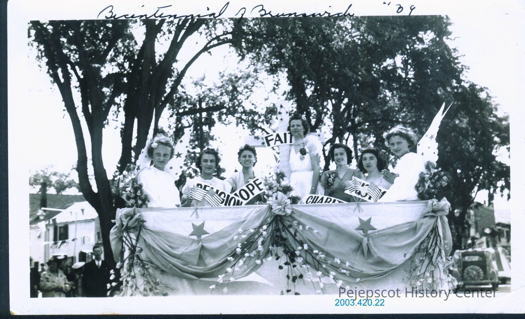 A black and white photograph of the Sodality of Mary float in Brunswick, Maine''s, Bicentennial Parade on 7/3/1939. The Brunswick record reported on 7/6/1939 that the float "was beautifully executed and had ten girls representing the religious virtues."