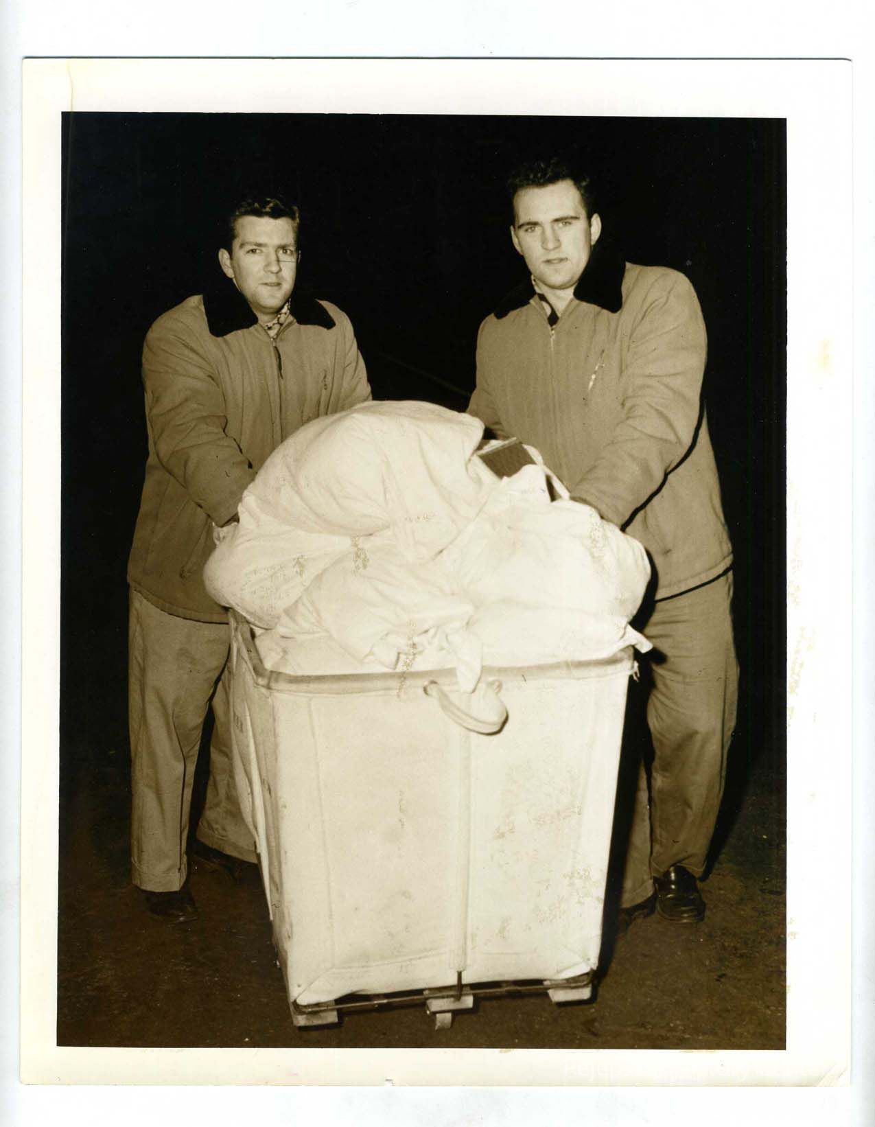 Two men wheel a soiled laundry cart. Both men are wearing winter jackets with fur collars. Undated