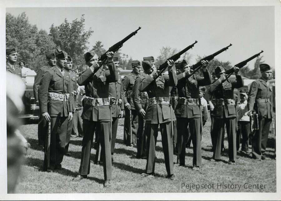 B/W photo of a group of soldiers with rifles during a Memorial Day celebration. Probably early 1940s.